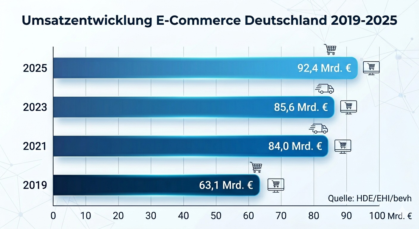 Der Versandhandel hat sich in den letzten Jahren in Deutschland zu einem bedeutenden Vertriebskanal entwickelt. Laut HDE wird 2026 eine Versandhandelsumsatz 96,2 Mrd. € erwartet, d.h. ein Plus von 4,11 % gegenüber dem Vorjahr (92,4 Mrd. €).